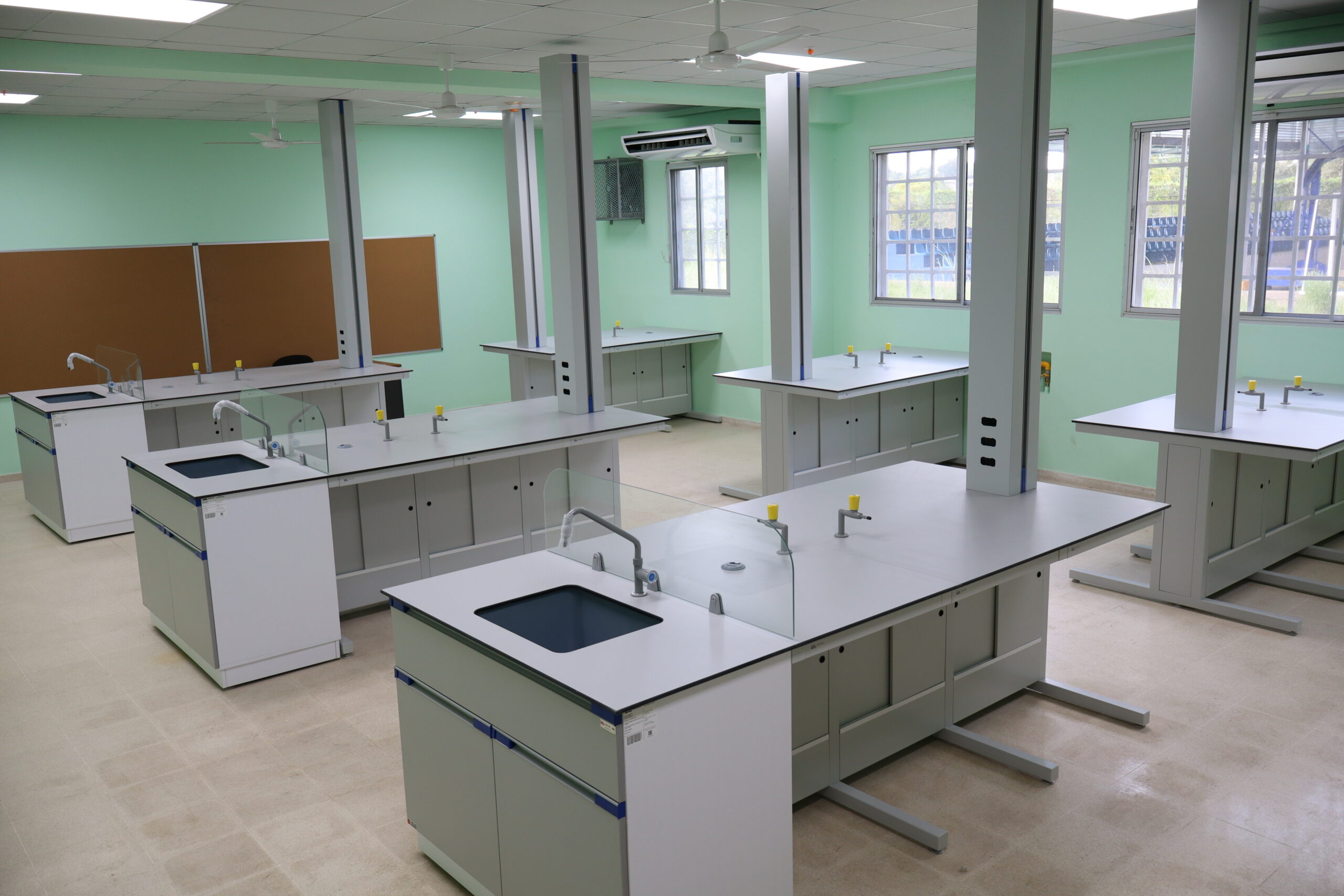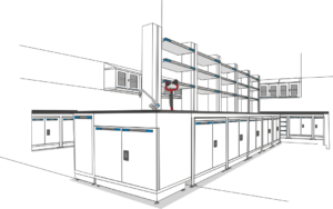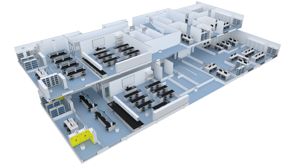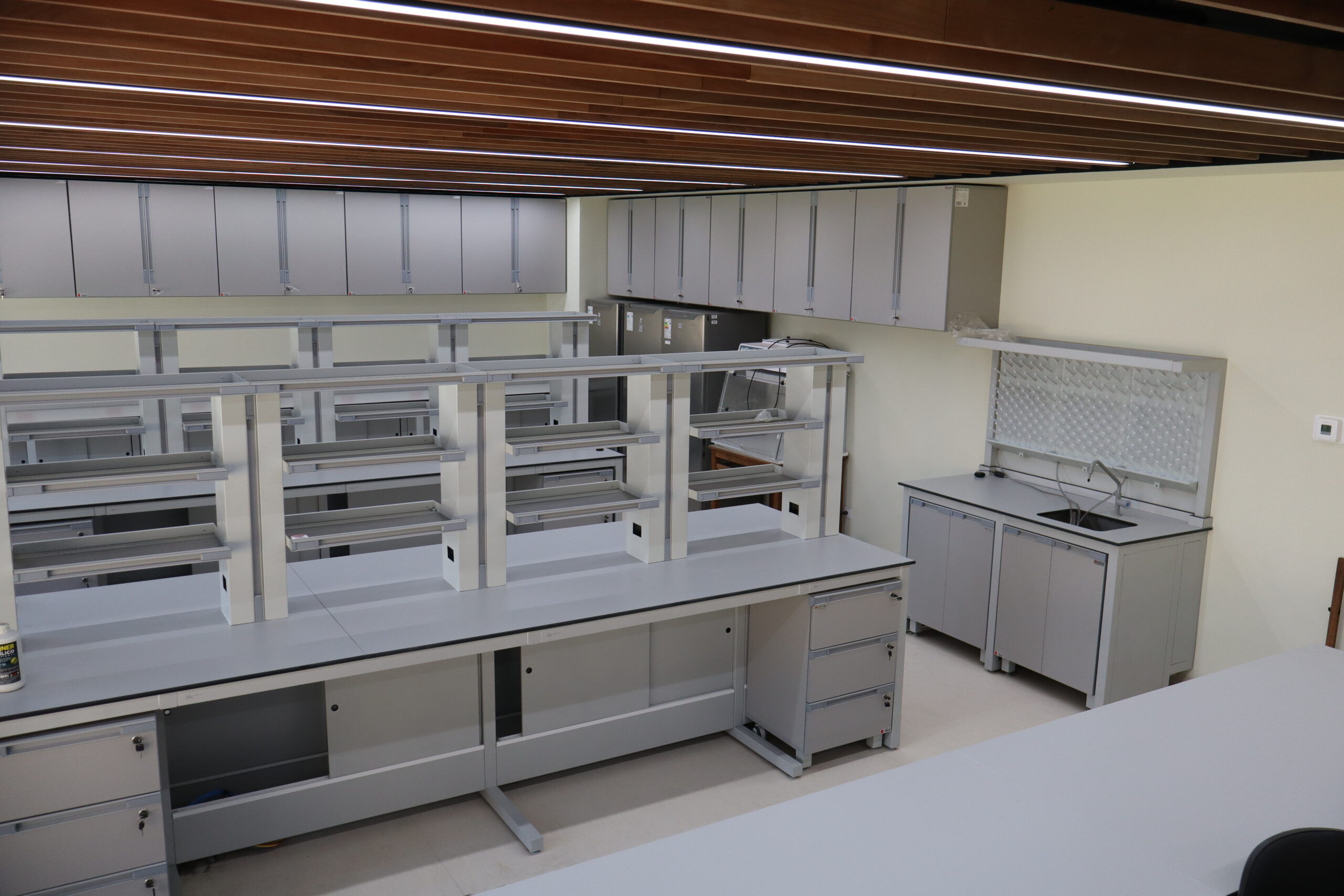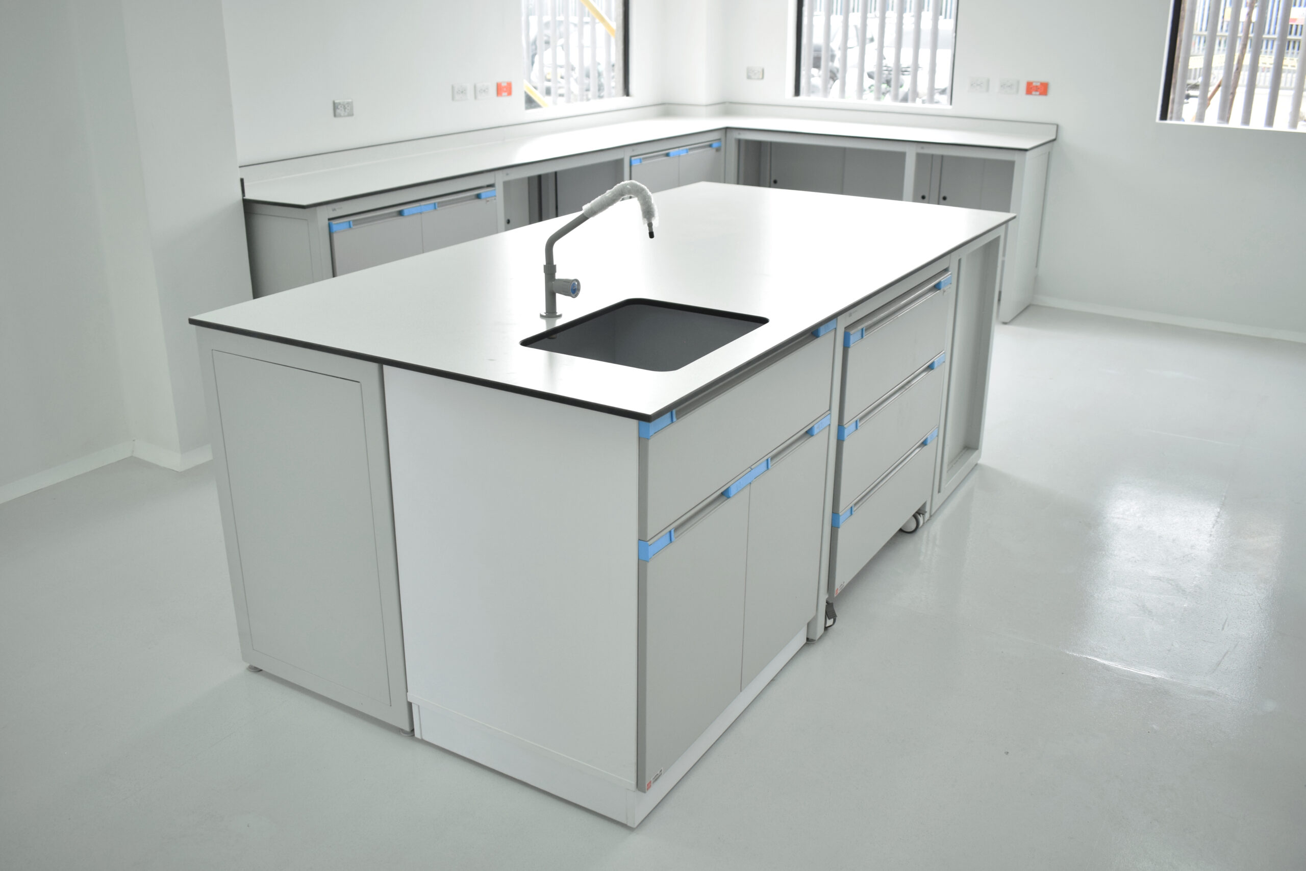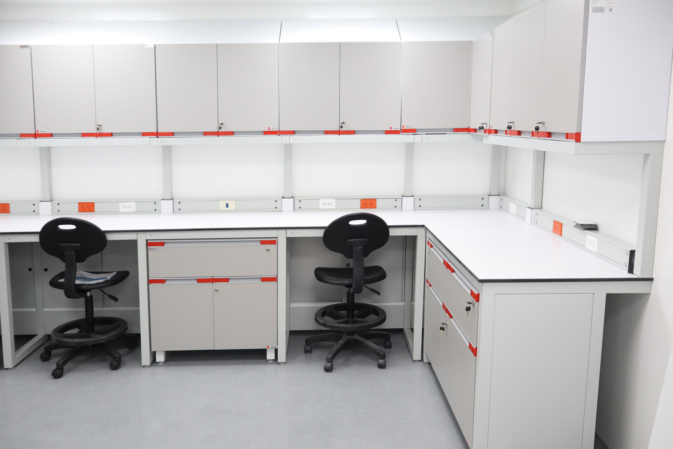 Nuestros gabinetes superiores se instalan directamente en la columna vertebral del panel de servicios o en la pared, evitando espacios visibles. Incorporan manijas de polipropileno fundido a presión, sin juntas, que ofrecen alta resistencia química y un diseño que facilita el mantenimiento.