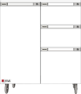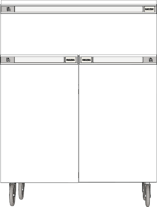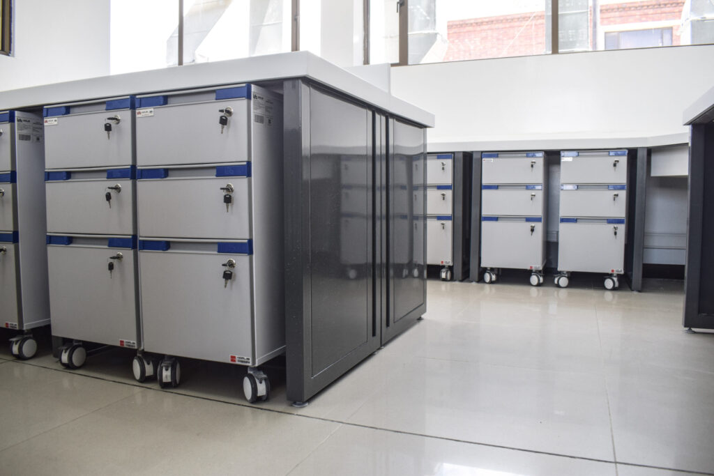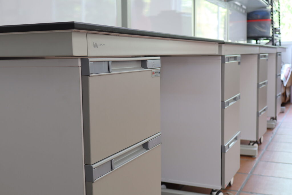 Nuestros gabinetes móviles cuentan con cuatro ruedas giratorias, dos con sistema de bloqueo, que facilitan su desplazamiento e integración a las mesas de laboratorio, manteniendo la misma altura que los gabinetes fijos.