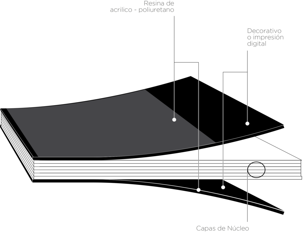 El gabinete está construido en tablero de partículas de 19 mm tipo RH termo-fraguado, altamente resistente a la humedad y enchapado con laminado termoestable de alta presión (HPL) según norma EN 438. Todas sus piezas vienen termoenchapadas y termoselladas en los cantos con borde rígido en PP, lo que asegura máxima protección contra la humedad. Incluye manijas en polipropileno de alta densidad con espacio para rotulado, bisagras tipo BLUM con recubrimiento anticorrosivo y correderas de extensión total con cierre estándar.